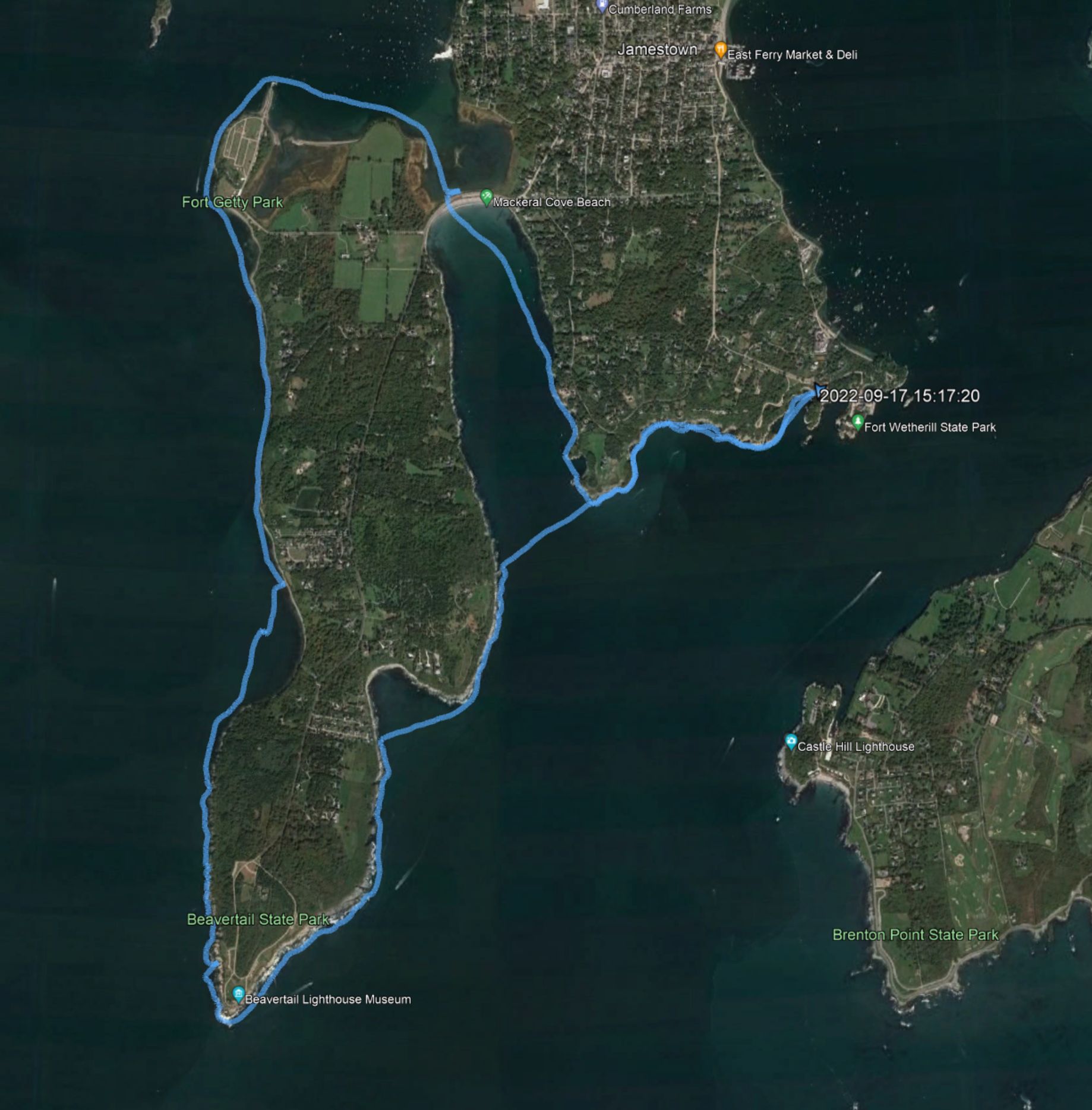 RICKA - Ft. Wetherill to Beavertail Circumnavigation - September 17, 2022 - This paddle was on a warm, clear day that started with no wind and no ocean swells. These conditions allowed easy paddling quite close to cliffs and rocky passages that normally would be limited to cautious rock gardening. The passage around the Beavertail lighthouse in calm conditions also allowed paddling close to the shoreline. Normally passage around the Beavertail point is maintained at a safe distance to avoid breaking ocean surf, which can be serious at times. To circumnavigate just the Beavertail section of Jamestown Island, we did a carryover at the Mackerel Cove Beach, allowed during off season. This resulted in a paddle of about 10 miles, as opposed to circumnavigation of Jamestown Island, which would be about 20 miles. To locate the route on Google Earth, use this gpx link. The paddle route is in this image.
