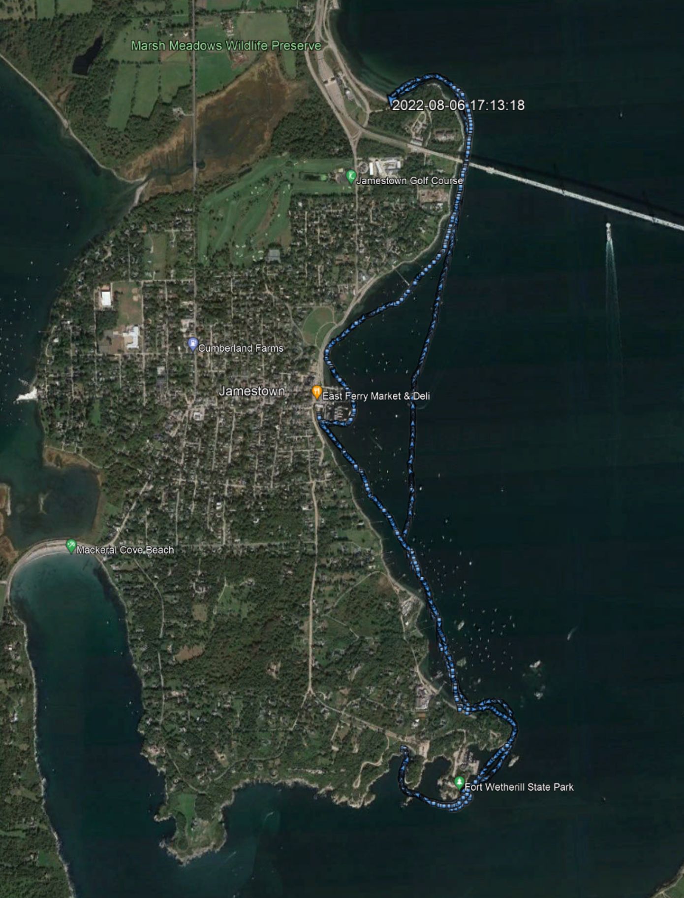 Potter Cove to Ft. Wetherill - August 6, 2022 - This paddle was on the day of the "Save the Bay" swim from Newport to Jamestown, at Potter Cove. When Ann finished paddling in the Safety Squad, she waited for me to join her for a paddle on a hot day. The temperatures in Providence were up to 90F, so there was going to be a strong on shore breeze from the ocean. Our plan was to paddle south before the wind got too strong and use the wind to bring us back to Potter Cove. We paddled about 7 miles round trip into the Scuba cove at Ft Wetherill and back. The onshore breeze picked up on return, causing a few difficulties offshore at Ft Wetherill. To locate the route on Google Earth, use this gpx link. The paddle route is in this image.