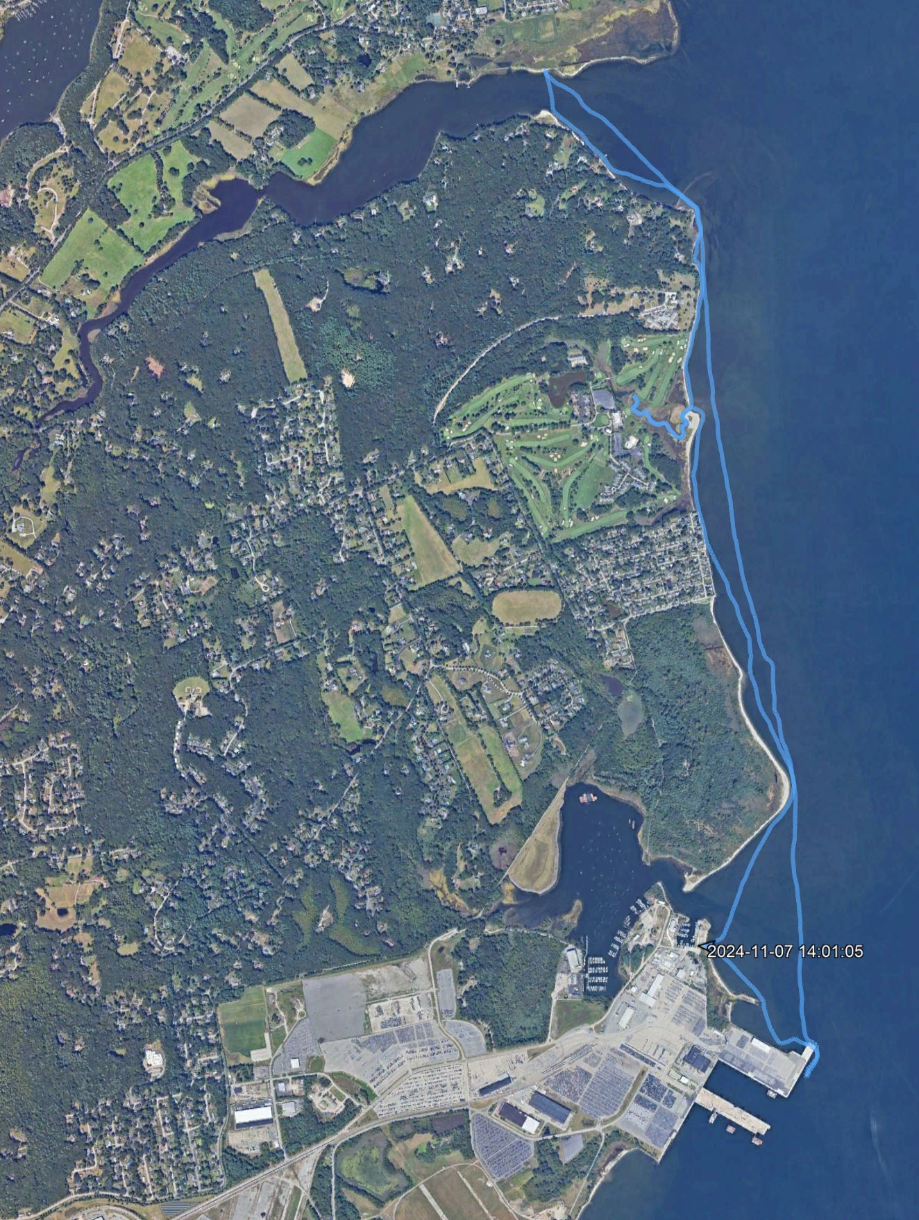 Spink Neck Beach to Potawomut River November 7, 2024 - Ricka L2 paddle from Spink Neck Beach (Narragansett Bay) to Potawomut River, with side ventures at the old Rune Stone site and Davisville dock. Late Fall paddle while weather was still nice and water not yet cold. To locate the route on Google Earth, use this gpx link. The paddle route is in this image.
