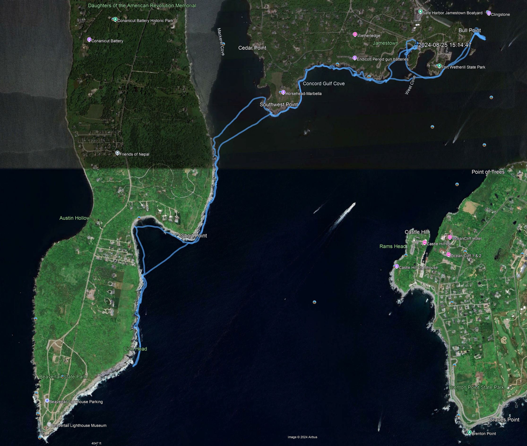 Ft. Wetherill to Beavertail August 25, 2024 - A Ricka L3 paddle which was quite calm for rock play. The paddle was only partially down East side of the Beavertail since high tide floods out any suitable landing for lunch on the West side. Hence we returned to Hull Cove for lunch. To locate the route on Google Earth, use this gpx link. The paddle route is in this image.