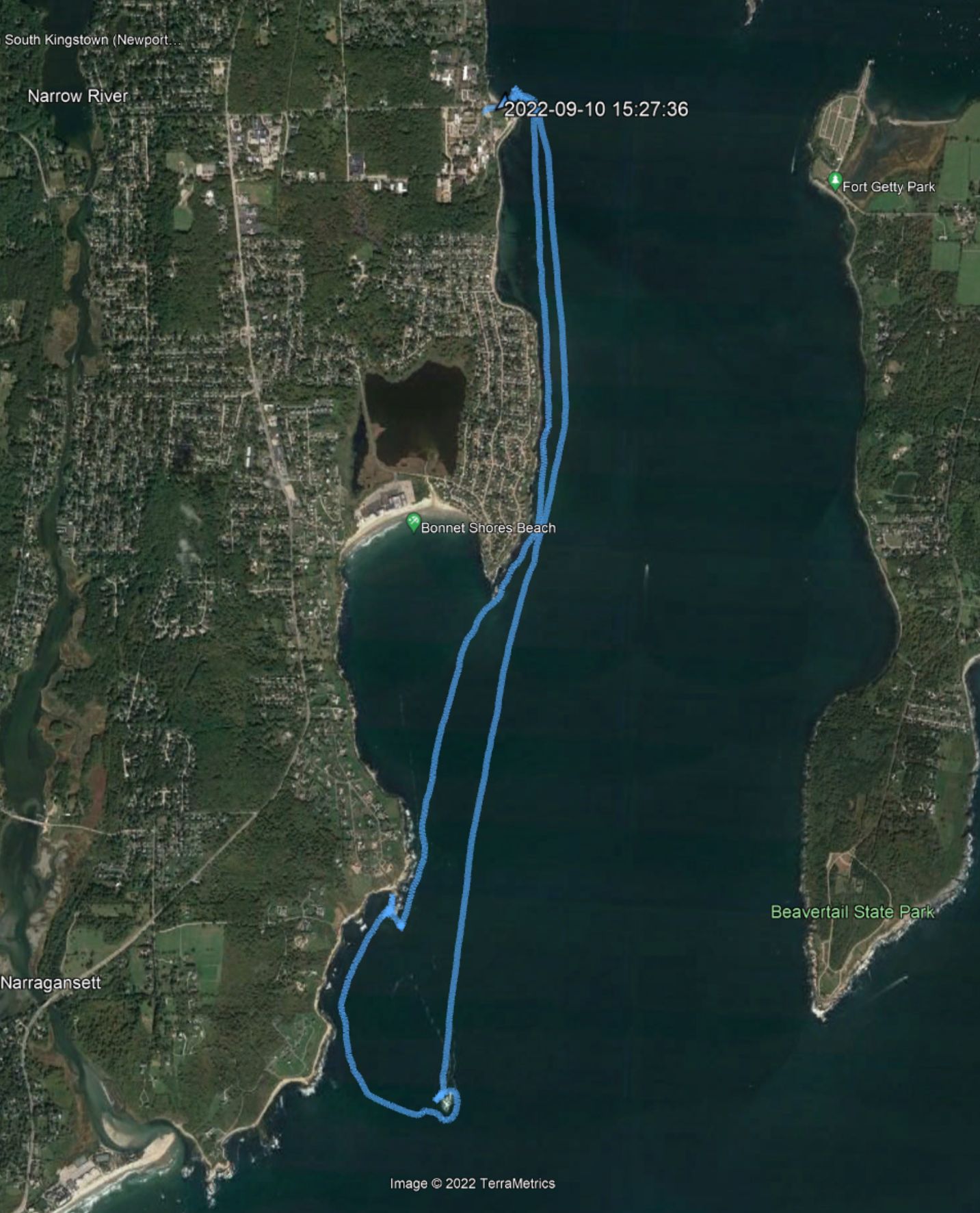 RICKA - URI Bay Campus to Whale Rock - September 10, 2022 - Hoping for some good swells from Hurricane Earl, Ricka paddlers went from the URI Bay Campus to Whale Rock in search of good fun either rock gardening or surfing. Although the swells were less than hoped for, suitable surf was found near the shore. After returning to the Bay Campus, several members practiced rescues and rolling. The weather clear and the air was in the upper 70's with ocean water still at 70F. To locate the route on Google Earth, use this gpx link. The paddle route is in this image.