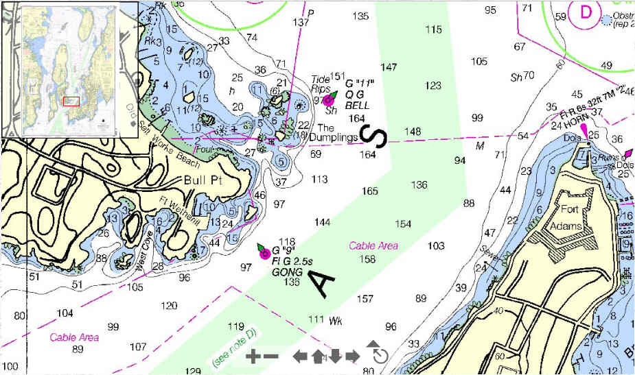 On-Line raster maps and an 'easy to use' viewer are available from NOAA. (If you have dialup internet, forget about using this site, megabytes of data are transfered.) The Atlantic Region is a list of maps, that are linked to the viewer, which automatically displays that region. You will need the Adobe Flash Player Plugin installed (if you can view YouTube, you have it) to see the maps. All the maps can be zoomed and panned, but are limited by size to 925 x 550 pixels. (Sample at full resolution) There is no way to print the on-line map, but you can use a screen capture program to save the image, and then print it. Some of the maps for the Narragansett Bay region are listed in the following table. You can click on the chart number in the table to view that marine chart. (Charts will open up in a new window.)