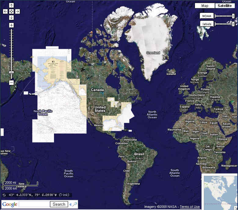 Online Mapping software by Geogarage has a demo World map with marine charts of United States coastal areas, including the Gulf Of Mexico and the Great Lakes. (If you have dialup internet, forget about using this site, megabytes of data are transfered.) Google satellite images and street maps are overlain with NOAA marine charts. You have control of the tranparency of the overlays. (Sample World map) For more information about the site and how to use it, link to this page. As useful as this site is, it is still a demo site and may not be available in the future. Note that the Delorme GPS PN-20 and PN-40 and other full feature GPS's can do the same thing as Geogarage but on a much smaller screen. The disadvantage is you will have to purchase propriatory maps designed for your specific GPS. But the GPS is portable and waterproof for use in the marine environment, whereas the Geogarage system requires a computer browser and access to the internet. (Mobile PDAs in the marine environment may not be a good idea, not withstanding their portability.) Sometimes purchasing a commercial marine chart, waterproof and alot larger, is more useful. (The demo will open up in a new window.)