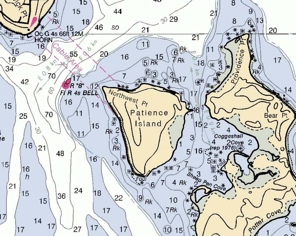 There are two types of charts that would interest the kayaker. The raster charts, electronic copies of regular printed marine maps, are available as Raster Nautical Charts (RNC) charts. Vector charts are more commonly used in on board electronic displays such as GPS and RADAR displays, and are available as Electronic Nautical Charts (ENC) charts. Both types show depths, shoreline features and navigational features. The following discussion will focus on charts that can be printed and carried by the kayaker or used in the planning of kayak trips. For a list of all currently available NOAA printed charts (not just ENC and RNC charts), link to http://nauticalcharts.noaa.gov/mcd/dole.htm