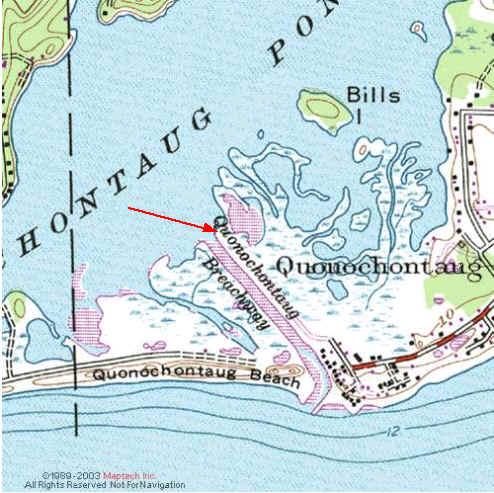 Quonochontaug State Fishing Area and Breachway, Charlestown: (State Fishing Access) Directions from Rt 1, exit at West Beach Rd. Go straight to the end of the road which will eventually bear slightly right and turn into a dirt road along a breachway. The State-owned 49-acre parcel runs parallel to the east side of the Quonochontaug Breachway. The parking area and pond/launch is at the very end. Parking is available at the end of West Beach Road for about 30 cars and boat trailers. The boat ramp located at this site is not the best to launch kayaks because the currents running through the breachway can be quite swift. The sandy beach at the very end of the road is a better spot for kayak launching, which is not in the breachway current. There are no portable toilets on site but nearby bushes provide limited discrete privacy.