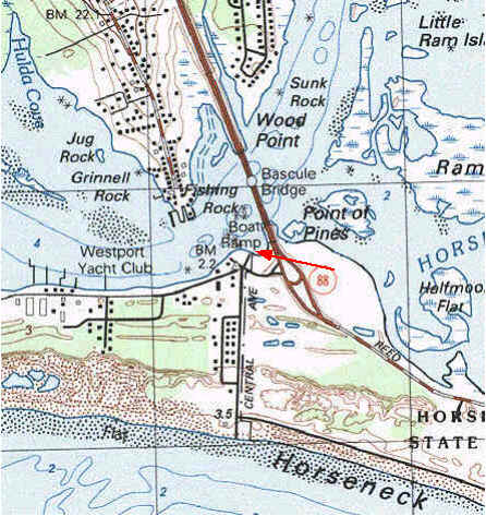Horseneck Beach ramp, Westport Mass.: (Mass. State Access) Directions from Rt 195, exit at Rt 88 (Exit 10), go south to end. Ramp is over the bridge, first street on the right. The main parking lot is next to the ramp. There is an overflow parking lot across the street in a wooded area just before you get to the main one. This is not the overflow parking area for the restaurant. A parking fee is charged per day and the signs for both parking lots say Parking for Trailers Only. It is not known if either is enforced off Season. There is a single portable toilet in the parking lot in Season.