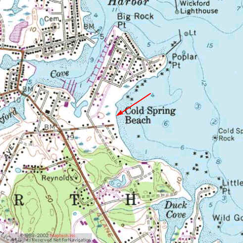 North Kingstown Town Beach, Wickford: (Town Beach) Directions from Rt 95, take Rt 4 south, exit at Rt 102 east into Wickford. From the south come up Rt 1 to join with Rt 4, exit at Rt 102 to Wickford. Continue on 102 thru stop light (pass by The Kayak Center), go over the concrete arched bridge (Rt 1A), and turn left on Beach St. Follow Beach St. to the very end and turn left. Go to the parking area after the snack bar. The sandy beach is long and narrow and backed by a three-foot-high bulkhead. Just behind the beach is a large grassy area shaded by tall trees, with many picnic tables, grills, playground equipment, ball fields, and a basketball court. Access is restricted to town residents during the summer. Off-season launching is OK. Sanitary facilities are available only in-season.