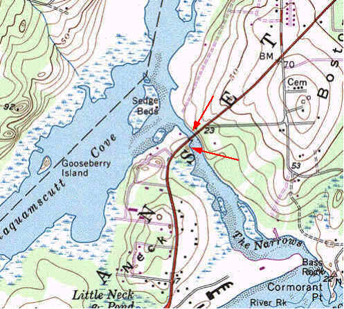 Narrow River DOT Boat Ramp: (CRMC designation n/a) Directions to site is from either north or south on Rt 1A. From the north on Rt 4/ Rt 1, take Rt 138 east, and exit before the Jamestown Bridge onto Rt 1A south. From the south, use the Narragansett exits and drive north on Rt 1A. The public access site owned by the Rhode Island Department of Transportation is just west of the new Route 1A bridge, on the north side of the Narrow River inlet. The boat launch ramp in very poor condition, better suited to hand launching. Parking is available for about 20 cars along the dirt access road parallel to Rt 1. There are no santary facilities but a wooded area provides discrete privacy. This site is used for easy access to the mouth of the Narrows, a good site for surf kayaking.