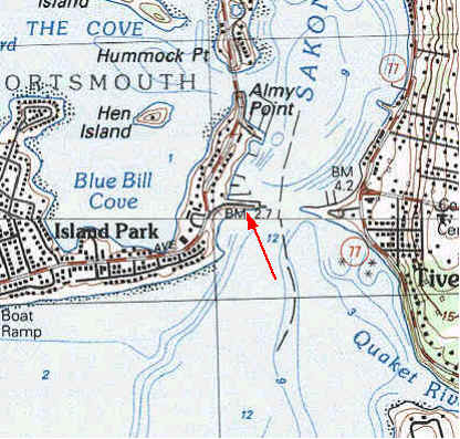 Old Stone Bridge, Portsmouth: (CRMC designation under review) Directions from Rt 24/Rt 138 north or south, take the Hummock Ave exit and go south to the site. From Rt 114 north or south, exit at Boyds Lane go south to Park Ave., and take a left. Located off Point Road, this site is the western end of the 1907 stone bridge over the Sakonnet River between Portsmouth and Tiverton. The bridge was partially destroyed in the 1954 hurricane, but the abutment has been converted into a fishing pier and parking area. Currently (2004) the pier itself is closed off. There is a small marina and boat ramp near the bridge and a State Beach (Teddy's Beach) just south of the bridge.