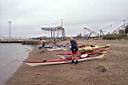 The beach is located on the right, (map) via either of two dirt roads just beyond the General Dynamics buildings. The beach is very popular with the small (Hobie type) catamaran sailboats. There are no sanitary facilities, but the new high speed ferry terminal next to the site has portable toilets. Parking is on dirt road above the beach.