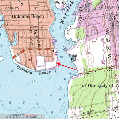 Oakland Beach, Warwick: (Town beach and fishing access) Directions from Rt 95 north or south, take Rt 117 (Exit 10A) east (West Shore Rd.) for approx. 4.5 miles, then turn right onto Oakland Beach Ave. (Venetian Garden Restaurant will be on the corner.) Go approx. 2 or 3 miles. to the end of Oakland Beach Ave. When you come to the divided parkway, do not go straight across into the Park. Turn left on Suburban Pkwy and go to the end and turn right on Bay Ave. This will lead to the launch area. The trailer/car parking lot is separate from the swimming beach parking. Not sure if there is a fee in the summer. There is a portable outhouse on site in the summer season.