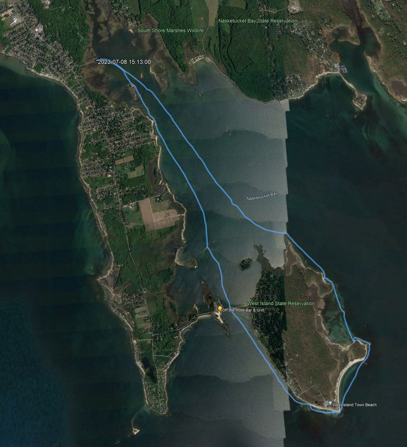 RICKA - Fairhaven to West Island - July 8, 2023 - Perfect Summer day from Fairhaven, MA, Edgewater dirt ramp with glassy conditions. Warm air with water about 70F and little wind. The paddle was about 9 miles in a loop around West Island. To locate the route on Google Earth, use this gpx link. The paddle route is in this image.
