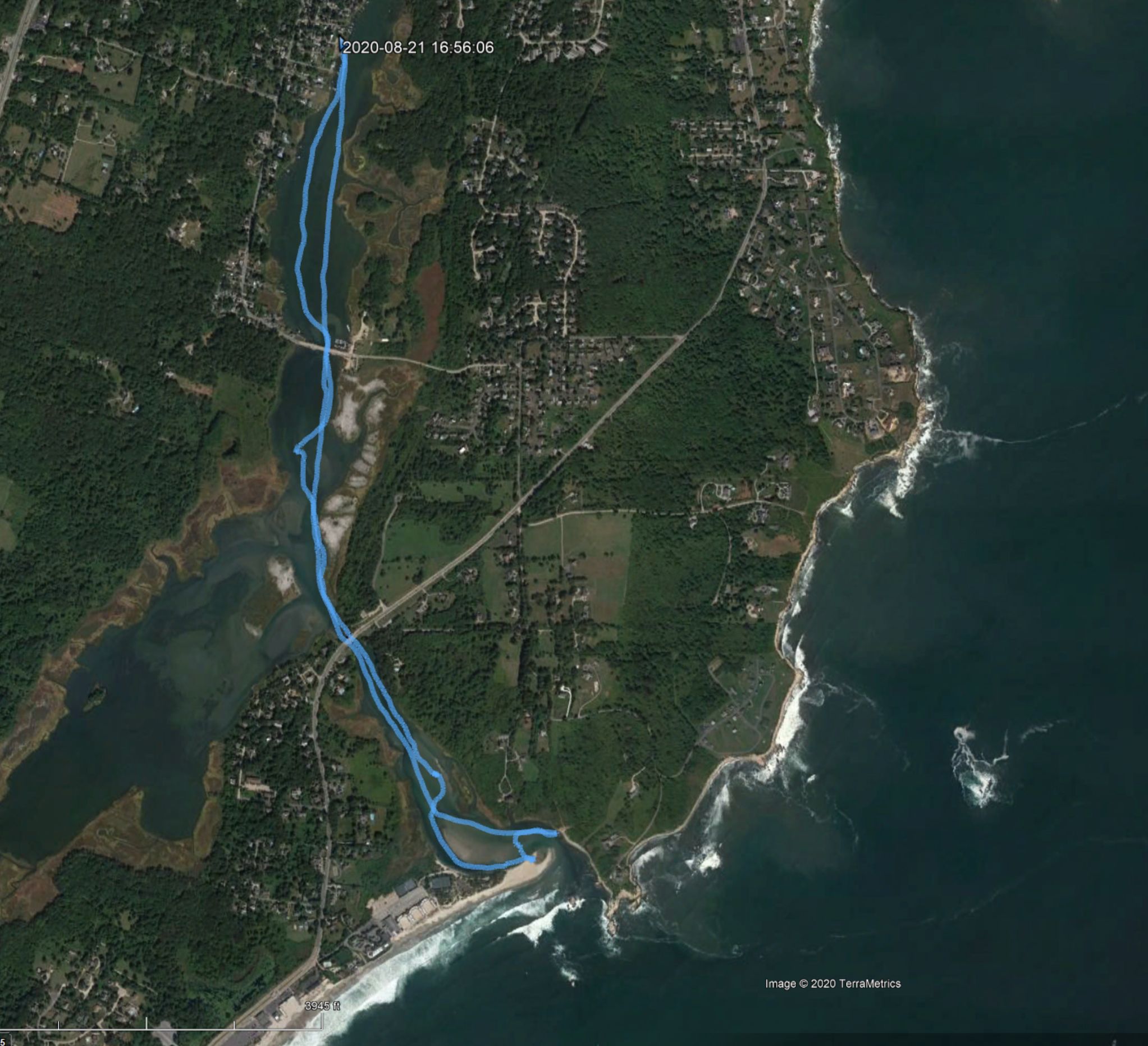 Pollock Ave to Narrows, RI - August 21, 2020 - This is a day kayaking from Pollock Ave public access, down the Pettaquamscutt river to the Narrows at Narragansett, RI. Nice warm weekday without summer crowds on the sand spit at the Narrows. This image shows the paddle route. Tidal flow and storms move and manage the sand in the area from one season to another. Out going tide this day provided two nice float downs into the Narrows. The outdoing tide and the strong on-shore wind caused rough water conditions at the entrance of the Narrows. A life was lost in similar conditions when recreational kayakers came down the Narrows in cold weather and capsized. Our second float shows the wave action. To locate the route on Google Earth, use this gpx link.