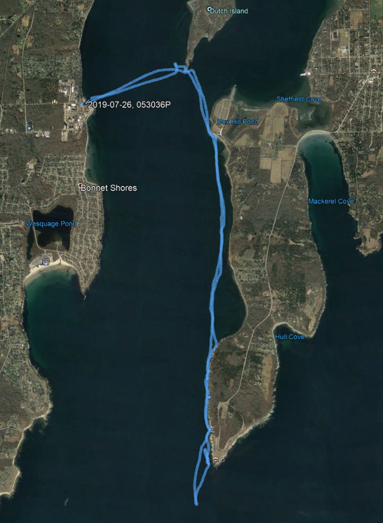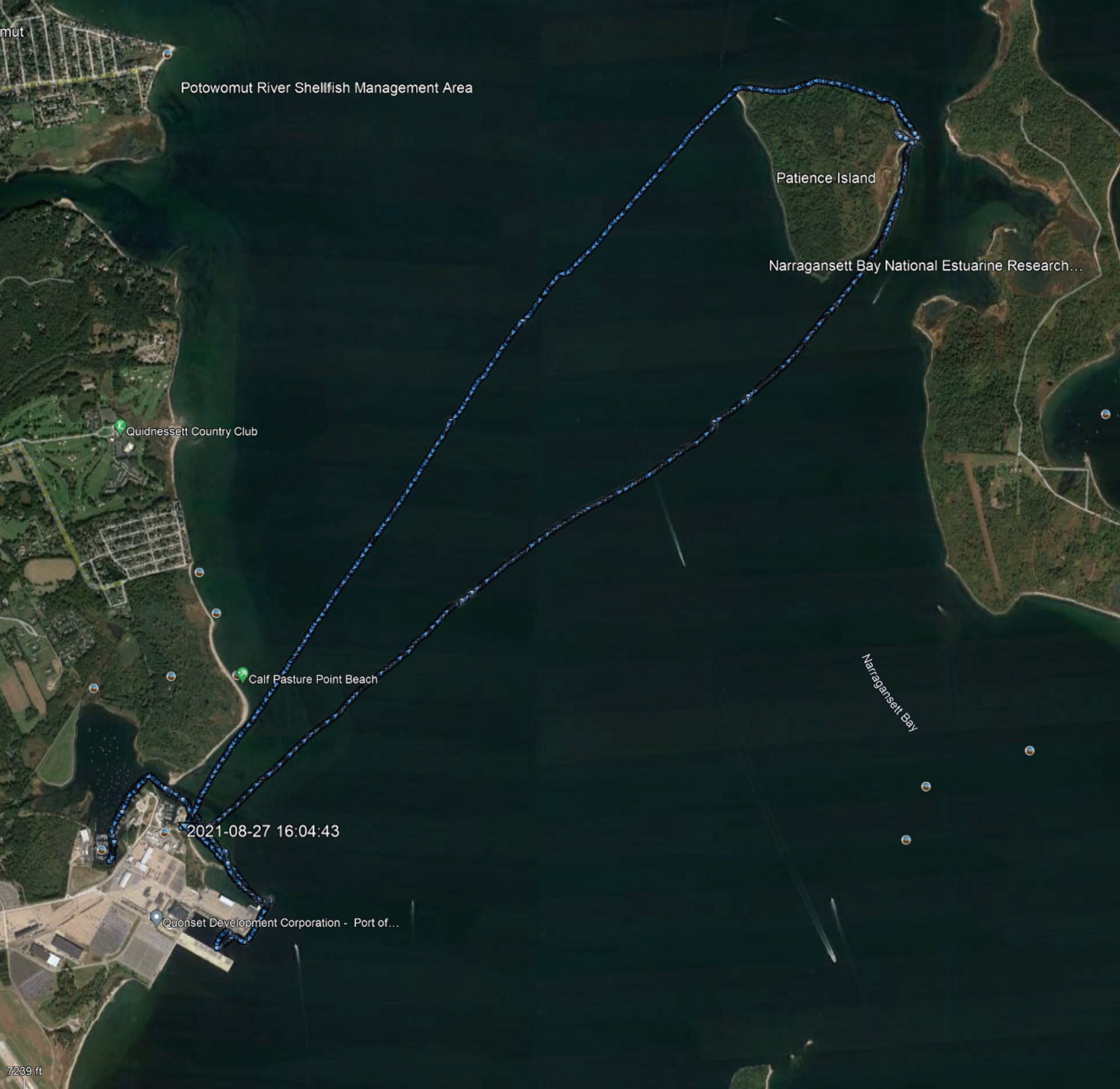 URI Bay Campus to Whale Rock, RI - August 18, 2020 - A Level 2 paddle from the URI Bay Campus to Whale Rock in Narragansett Bay. The wind was from the south southwest and our route was in the lee of land for most of the paddle, making it an easy and pleasant paddle. When we lost the land protection from the wind, the 15 kt wind made the paddling more difficult and produced a quick chop to Whale Rock. Once at the rock, the natural smallish cove on the NW did not give the protection that I expected for my paddling partner. It would be proper to call it Level 3 around the rock. So we only stayed for a few minutes before turning around and heading back north. Heading back was much easier with the onshore wind and following sea. The air and water temperatures were in the 70's so it was a pleasant paddle, with a touch of excitement. To locate the route on Google Earth, use this gpx link.The Google Earth route is in this image.