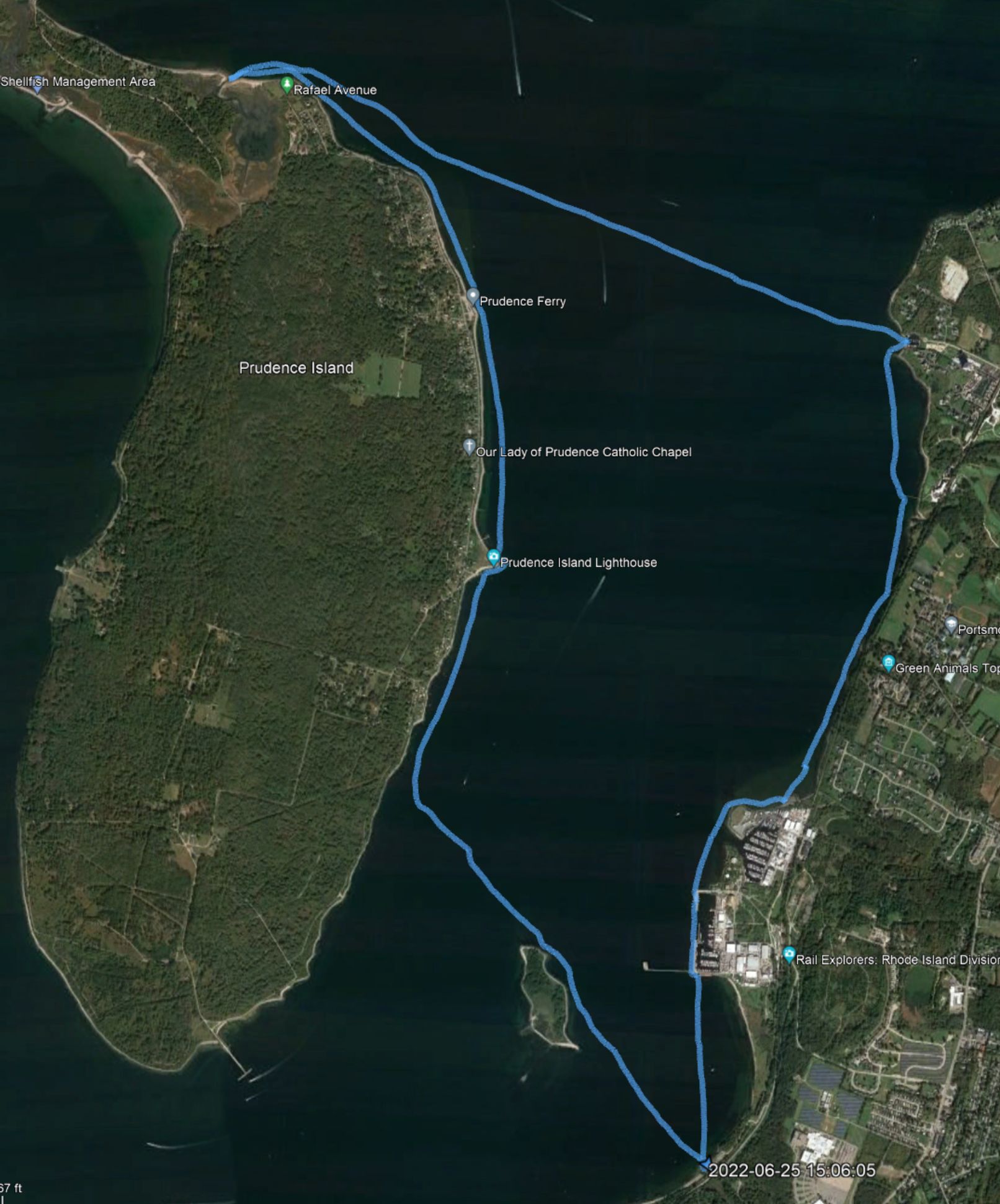 RICKA - Weaver Cove to Prudence Island June 1, 2024 - This Ricka paddle was a Level 2 from the State launch at Weaver Cove. The route passed the little Dyer Island and proceeded under the south end of Prudence Island. On the west side the paddle was only half way up Prudence to a stone beach just north of the Broadway stone pier. A very calm day with water almost glassy. To locate the route on Google Earth, use this gpx link. The paddle route is in this image.