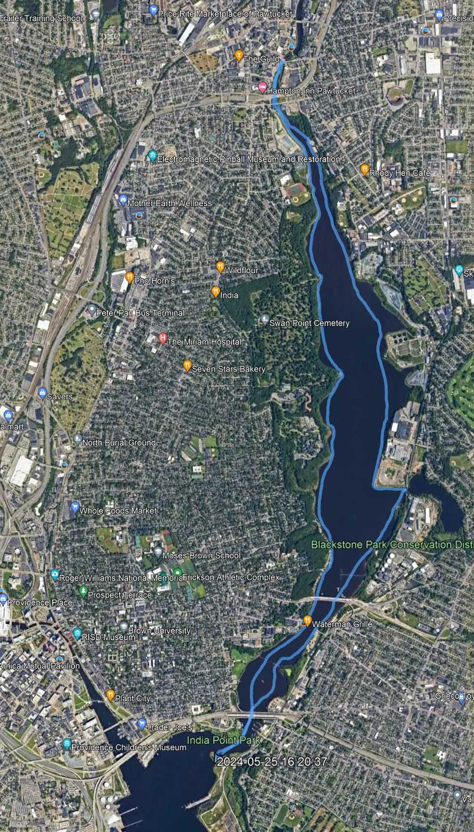 Bold Point Park to Pawtucket Falls - May 26, 2022 - Only two of us doing a Spring paddle from the Bold Point Park boat ramp up the Seekonk River to the Pawtucket Falls. The Falls are just below the historic Slater Mill and dam. A breezy day with a strong wind from the south eased paddling upstream but was a workout going back to the launch. The shoreline has scraps and remnants of many vessels that have been abandoned to just decay away. The Falls today has an operational hydro station just below the Falls. This accounts for the volume of water flowing out from the brick building on the west bank. To locate the route on Google Earth, use this gpx link. The paddle route is in this image.