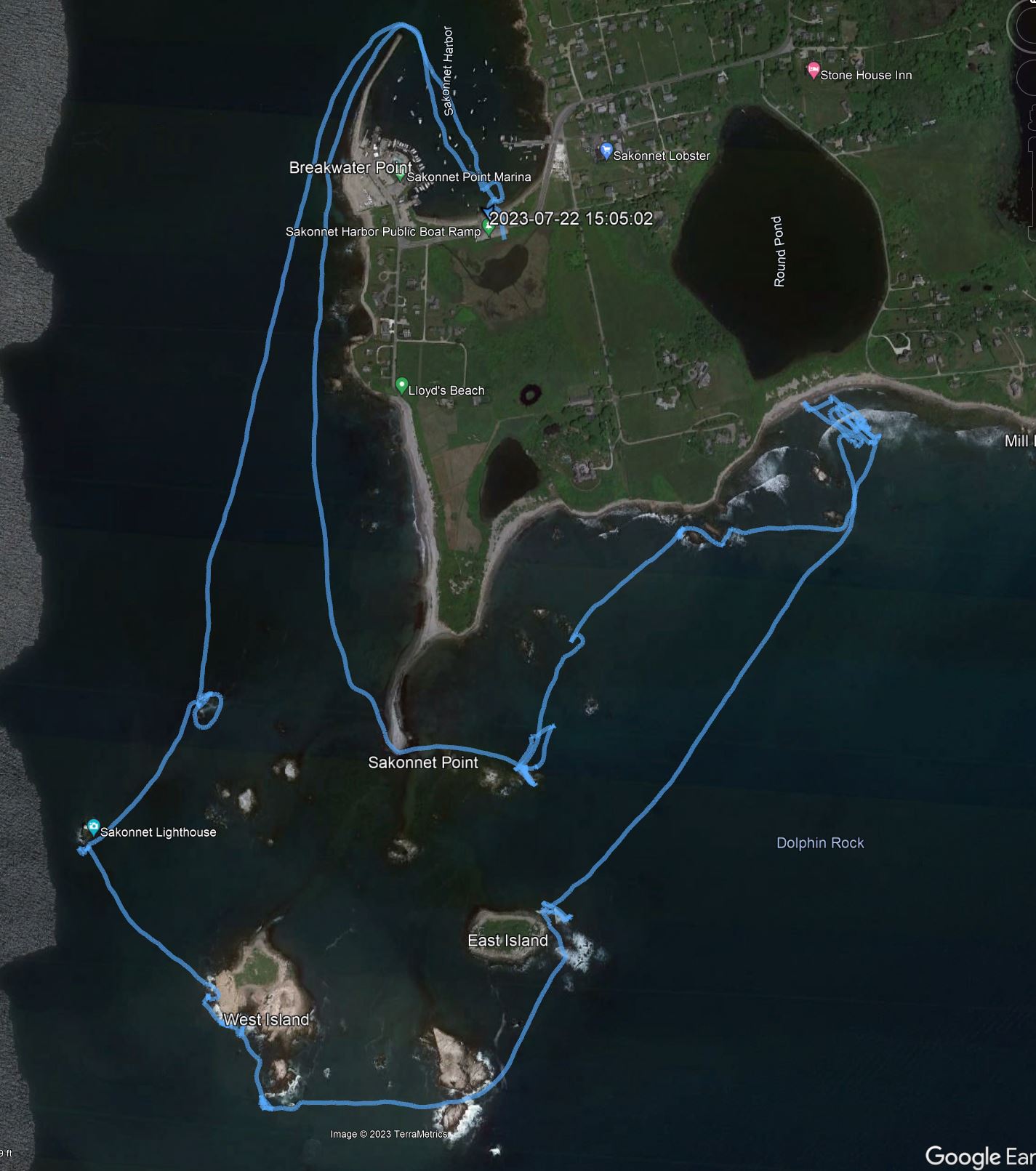 RICKA - Sakonnet Point Rock Gardening - July 22, 2023 - A Ricka paddle, level 3-4 looking for fun around the rocks and islands off Sakonnet Point, RI. Launching in Little Compton, RI at the public beach. Called rock gardening as in challenging the surf around the rocks and islands. A warm bright day with minimal wind and hardly noticeable swells in the ocean. But enough energy to form some wave action against the rocks. Some dumps in the surf made it an interesting day. To locate the route on Google Earth, use this gpx link. The paddle route is in this image.