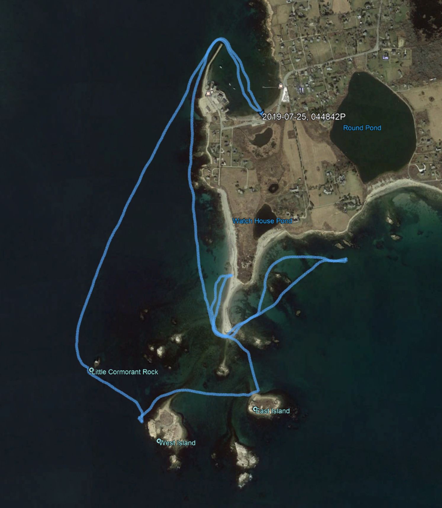 Sakonnet Point, MA - July 25, 2019 - The weather was perfect, sunny, in the mid 70's with a light onshore breeze. Leaving from the Fishing Access launch in Sakonnet Harbor, RI, we paddle out and around the rock breakwater and head toward the lighthouse. The general surf direction was from the southeast, with swells only a foot or so in among the islands. After going around the light house we paddled over to West Island but since there was no landing other than a rocky shore, we decided to head back toward the Sakonett point for a lunch break. The "point" is actually a stable sand spit, maintained by wave action coming from both sides. The video shows the interesting dual and opposing wave action. After lunch we headed around the spit and eastward. In a short time we turned back because of time constraints, plus the shore break (exposed away from the protecting islands) might be a landing problem. There were only two of us and only one had experience in landing in surf. To locate the route on Google Earth, use this gpx link. The Google Earth route is in this image.