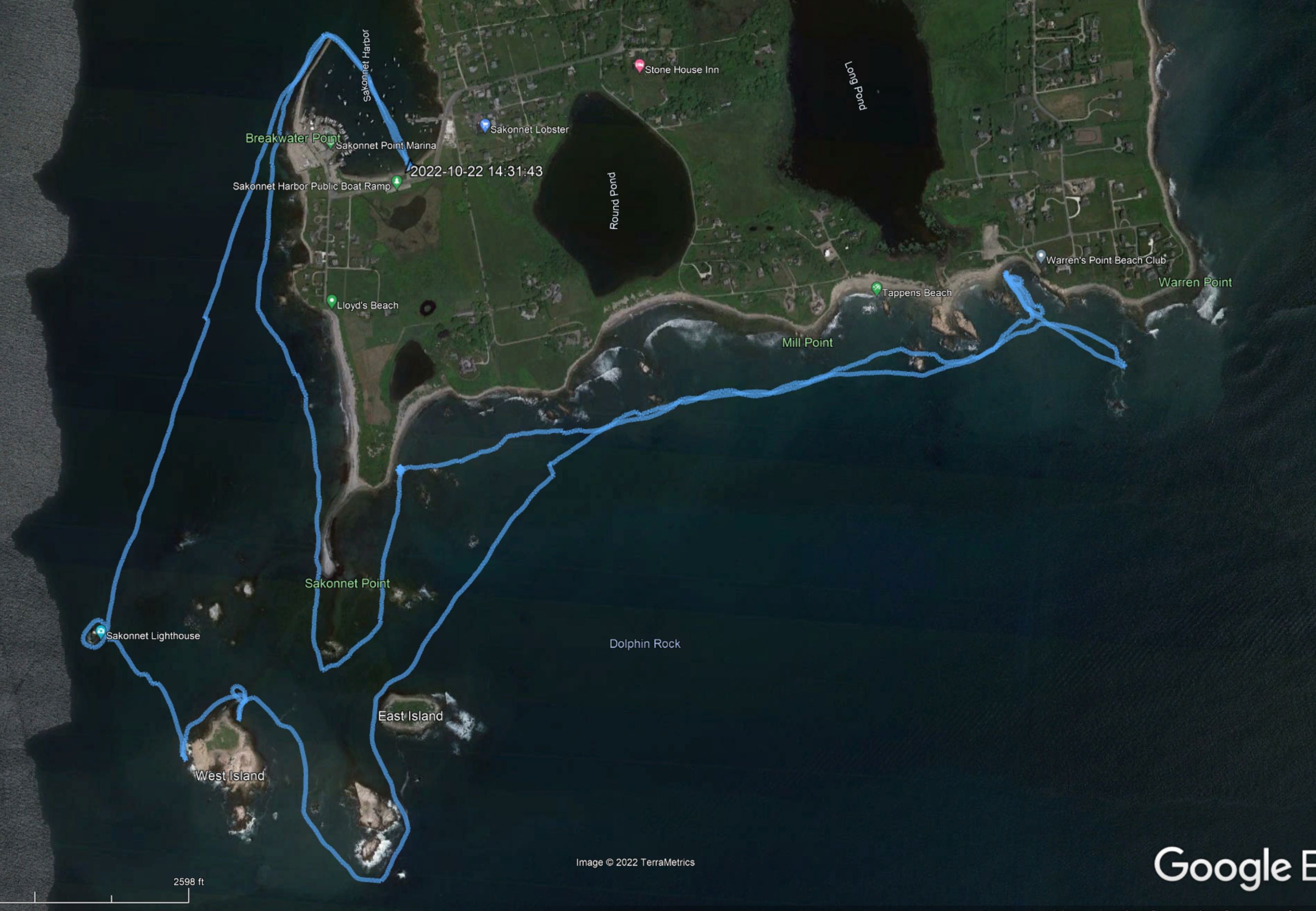 RICKA - Sakonnet Point paddle - October 22, 2022 - (Video title dated incorrectly.) A relatively calm Fall day paddling around the islands and rocks. A nice 'after season' beach landing for lunch on a rock with a view. To locate the route on Google Earth, use this gpx link. The paddle route is in this image.