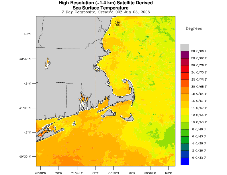 For satellite IR water surface temperatures for Southern New England, look at the new NOAA (sample data) Sea Surface Temperature page. Click on the table item you want to view for a 7 day composite image. More specific daily images from each satellite over the East Atlantic Coast (real time, incl. Cape Cod) (sample image) is the link to Rutgers Univ. For a beautiful image of the whole North Gulf Stream (from Cape Hatteras to Newfoundland) (sample image) link to Live Weather Images. For “more-than-you-ever-wanted-to-see” satellite images, link to this main page or try NASA.