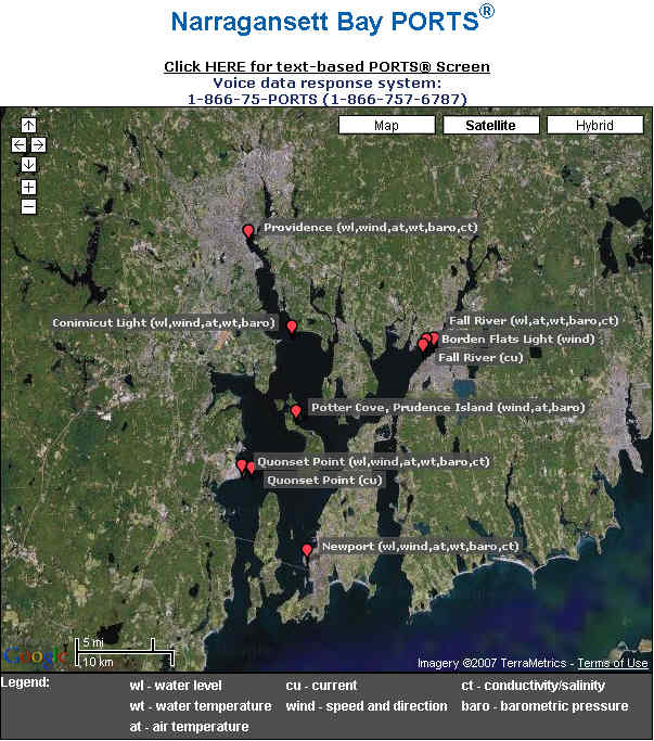 For a quick look at the present wind and air conditions at six locations in the Bay (sample map) link to the [Physical Oceanographic Real Time System] PORTS map. For detail 3 day charts, meteorological and oceanographic data for any of the PORTS stations (sample map) in the Bay, link to the Narragansett Bay PORTS. (which now uses Google Maps, dialup takes over 4 minutes.) For a snapshot of all stations in real time, link to the text version of PORTS. Also available is a nice composite chart (sample chart) of conditions in the middle of the Bay at Quonset Point.