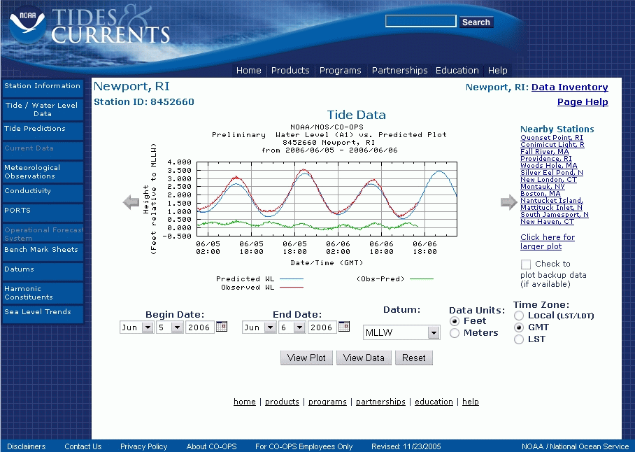 To see the present air and water conditions in Narragansett Bay showing 48 hr realtime plots (sample plots) of air [temperature/pressure/speed/direction], and water temperature (only at Newport, Conimicut, Providence) and tides, link to NOAA . For oceanographic data for locations anywhere in the USA, look at the CO-OPS main page.