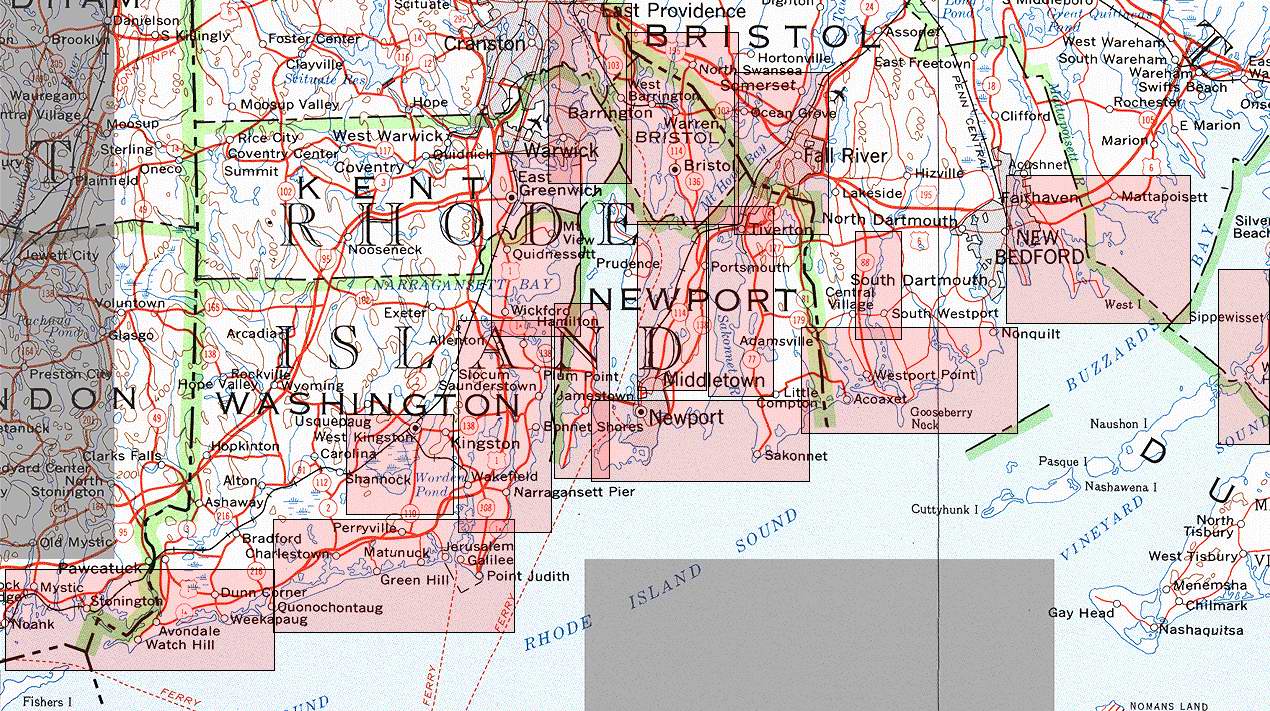These maps contain about 100 launch sites which were derived from Ricka information, that published on the Sea Grant ”The Daytripper's Guide to Rhode Island” and that available from the Rhode Island Coastal Resources Management Council (CRMC). The current legal Public Right of Way (ROW) status of some of the RI sites has not been resolved due to lack of funding. If you are curious, check my copy of the CRMC Public Right of Way status page and the ROW designation process. All coastal access points need not be on the CRMC list, some are State owned sites, some are under the jurisdiction of the towns and cities.