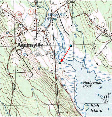 Adamsville Landing, Little Compton on the West Branch of the Westport River: (no CRMC designation) From Providence take RT 195 East to Exit 8A (RT 24 South). From Newport take RT 138 East (or Rt. 114) to RT 24 North. Then from both directions take Rt 24 to exit 1A (Rt. 81 South-Adamsville). Continue straight and through the light for several miles. Come to the end of the road and turn LEFT at the stop sign. Take an IMMEDIATE RIGHT onto Westport Harbor Rd. (ball field will be on right) go 2/10 of a mile and landing is on the left, down the dirt road. There is limited turning once in the parking area. There are no sanitary facilities but bushes provide limited discrete privacy. Watch out for Poison Ivy. Be warned that the West Branch is very tidal, and at low tide the muddy shallows farther down the river may block access to or from the lower part of the river. You could be stranded.