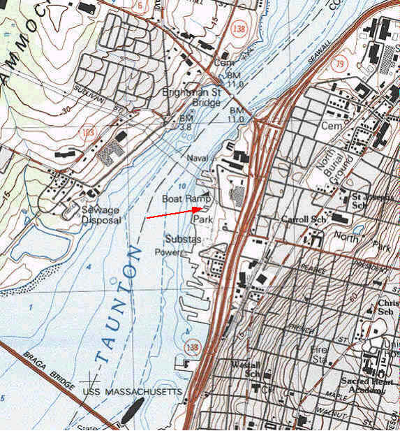 Fall River Bicentenial Park (Town Park) From the west on Rt 195, exit at Rt 6 (Exit 3) head east on Rt 6 to the Brightman Bridge. Immediately after crossing the bridge, take the first right to head south on Davol St. (a one-way street.) The Bicentenial Park entrance is on your right. Alternately also from the west, exit at Rt 103 (Exit 4) and continue to Rt 6 at the entrance of the Brightman Bridge. If coming from Battleshlip Cove, head north on Rt 79 going all the way to Brightman Street, loop around to the left and come down Darvol St. There is a large parking lot for 40 or more cars and trailers. One side is for trailers, the other for cars. The concrete ramp is steep and appears slippery. There is no sandy beach for launching. Knowledge of sanitary facilities is not known. There were none off-season.