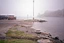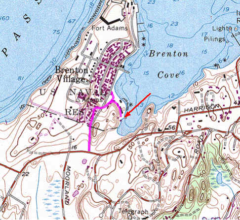 Fort Adams State Park, Newport: ( State Public Launch) Directions from downtown Newport, turn South onto Thames St. (one way), go by Salas' restaurant, then turn RIGHT (west) onto Wellington Ave. At Ft Adams State Park on Harrison Ave., enter the Park. Keep to the right on the entrance road. Note the sign for the Boat Launch. Continue to the waterfront and turn right, just before the beach, proceed on the roadway next to a long white building to the parking and launch area. Note the topo map above reflects a time before the Park was formed and the parking areas were filled with Navy housing. A portion of the new roads are in magenta. The concrete launch site has parking for about a dozen cars and trailers. Additional parking is along the entrance road. There are no sanitary facilities at the ramp. But there is a small path above the launch parking lot, leading to a public restroom beyond a picnic area. The pentagonal brick restroom can be seen on the hill to the right as you drive to the launch.