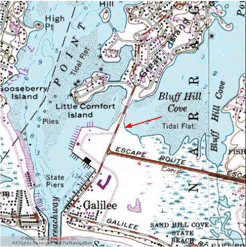 Galilee Access at Great Island Bridge, Narragansett: (State Fishing Access Site) Directions from Providence direction; take Rt 95 south to Rt 4, continue south on to Rt 1, past Tower Hill interection. Exit Rt 1 at Narragansett Exit on to Rt 108 south. Coming from the west on Rt 1, exit to Rt 108. Continue on Rt 108 (Pt Judith Ave) about 3 miles. Just before the water tower (on your right) , turn right onto the Galilee Escape Rd. Follow the Escape Rd. to the end and turn right. Just before the bridge to Great Island, pull into the Galilee State Boat Launch. Drop your boat and gear at the ramp then park in the parking lot.just behind the launch site or across the street This state-owned fishing access site has a boat ramp with parking for about 50 trailers. Use is restricted to fishing (boat launching), as opposed to ferry parking. The town Police have ticketed cars without trailers parked in the trailer parking, so use discretion. Cars can park across the street, there should be no parking fee. The parking situation for kayaks has not been clarified between the State DEM and the Narragansett Police. If questioned by the police, tell them the DEM said it was OK, and visa versa. There are two portable outhouses in the parking lot.