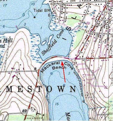 Mackeral Cove Beach, Jamestown: (CRMC designation n/a) Directions from Jamestown Bridge, take North Main Road exit, head south to stoplight, continue thru on Southwest Ave., swing right on to the Mackeral Cover causeway. If coming from the Newport Bridge, exit to downtown Jamestown and go south on Canonicus Ave (ie the main street thru town) and turn right on to Hamilton Ave. Situated at the head of a long cove, there is a sandy cobble beach, while the remainder of the cove has a rocky shore. There are lifeguards and portable restrooms during the summer. On-site pay parking is available to town non-residents during summer season Boats and windsurfers are allowed only after 5 p.m. and during the off season. There are several paths on the north side of the road through the bushes that access Sheffield Cove. A narrow sandy cobble beach is suitable for launching toward Dutch Harbor anytime except extreme low tides.
