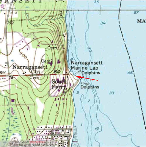 South Ferry beach: URI Bay Oceanography Bay Campus.: (CRMC designation public access) Directions from Rt 1 (north or south); from Tower hill go down Bridge Town Rd, (east), across the river and up to the light at Rt 1A. Cross the road onto South Ferry Rd. (There is a Rite Aid Pharmacy on the corner.) You can also reach this corner by coming south on Rt 1A from Jamestown Bridge (Rt 138) area, or north from Narragansett on Rt 1A. Watch for signs for the URI Bay Campus and NOAA. Launch from the beach at the very end of South Ferry Rd. Parking can be tight, so you may want to drop your boat and gear off at the beach and then park your vehicle in the Campus lot just above it. There are is a porta-potty in the upper parking lot for beach people, during Summer season. [This beach is one of the best and most popular launches for the West Passage.]