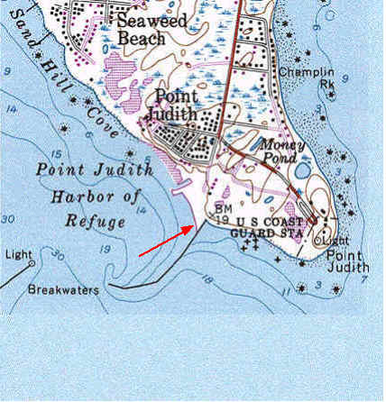 Point Judith , Narragansett: (State FishingAccess) Directions from Rt 1 north or south, exit on Rt 108 south, goto the end. The road will swing to the left and continue down to theCoast Guard Station. You will see a sign on the right for the Fishingaccess. Formerly Camp Cronin, a military camp, this site has a longrocky shoreline fronting the Atlantic Ocean near the Point JudithLighthouse. This site also provides access to the east arm of theHarbor of Refuge breakwater, a popular fishing area. A large parkinglot provides plenty of parking. Kayak launching requires a carry ofabout 200 ft to get to the beach. There are portable toilets onsite during summer season, during off-season low bushes provide limited discrete privacy.