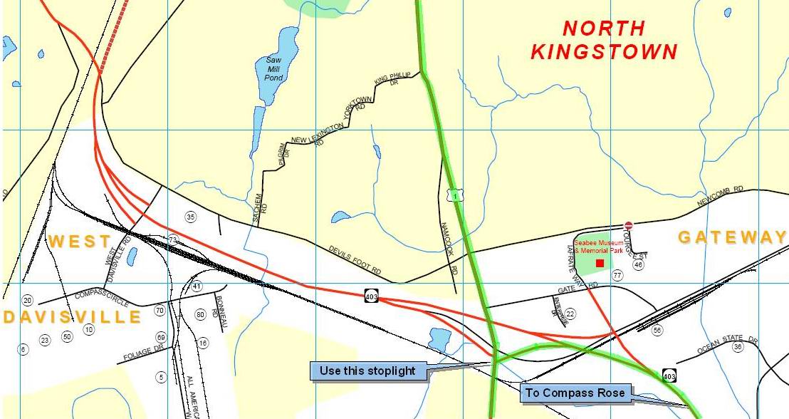 Directions from the south on Rt 1. At the Rt 4/Rt 1 fork, just north of the access highway to the Jamestown Bridge, do not take Rt 4 at the stoplight, but fork to the right and stay on Rt 1 to North Kingston. Go 4 miles to the new overpass(map), (map) at the first stoplight take the exit to Rt 403 east to Quonset Pt. You may also take the second stoplight on the north side of the overpass, but it is not as direct.