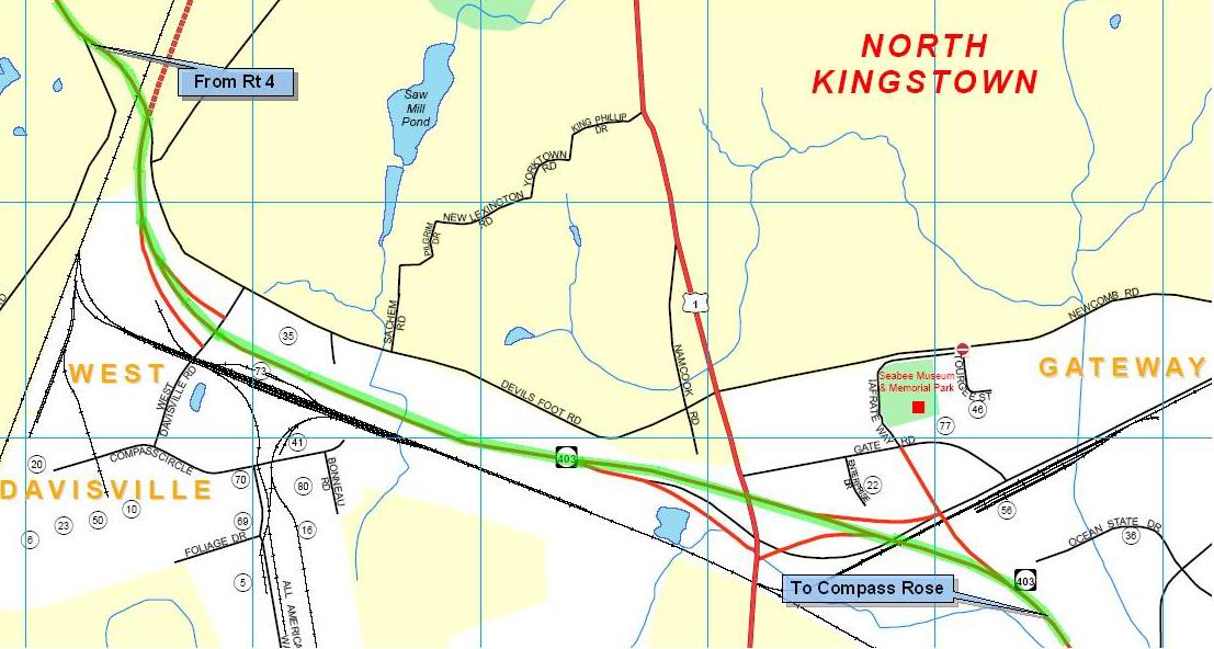 Directions from Rt 95, exit to Rt 4 south, take Exit 7 at Rt 402/403 (to Quonset Pt) and continue on Rt 403. After going over the new railroad overpass, (map) stay on the expressway, (do not exit at W. Davisville Rd.) Continue on the expressway and follow the signs to Quonset Pt.
