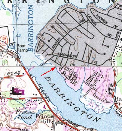 Wamsutta Avenue, Barrington: (CRMC designated access n/a, Town right-of-way) Directions from Rt 114 north or south, proceed in what ever direction on Rt 114/103 that leads to the Barrington High Shool area. Cross the Barrington River at Massasoit Ave. Immediately over the water turn right on to Bowden Ave. Wamsutta Ave will the second left street, with the launch path on the right. Kayaks must be carried about 200 feet to the Barrington River. The launching site is not marked, it is only a grassy depression leading to the water. Limited on-street parking is available. There are no sanitary facilities in this residential area.
