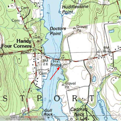 Hix Bridge, East Branch Westport River, Mass.: (Town Directions from Rt 195, take Rt 88 exit south for several miles turn left onto Hixbridge Rd. Continue "kind of" straight through small intersection. Landing is on right after going over little (currently under rebuilding) bridge. Entrance to parking is at the top of the hill up the road. Sign says annual parking permit required. The sign used to say for residents only. It is assumed that restrictions do not apply off Season. There are no sanitary facilities on site but there is a wooded area next to the parking lot.